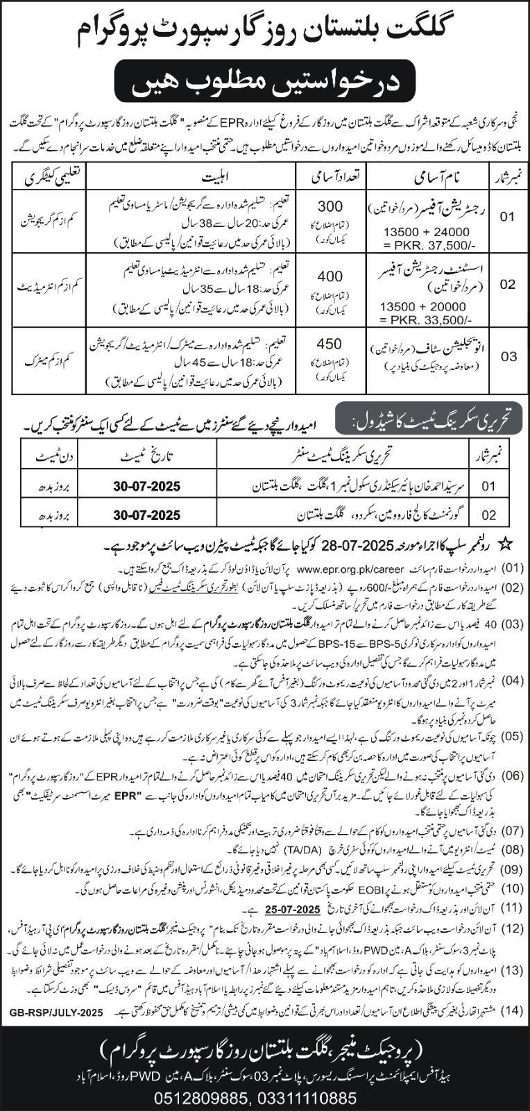 A job advertisment has been published in Daily K2 today on 11th July 2025 Gilgit-Baltistan Rozgar Support Program. This initiative aims to provide meaningful employment opportunities to qualified candidates across all districts of GB.Both male and female condidates can apply for 1150+ jobs for Gilgit region and Baltistan region